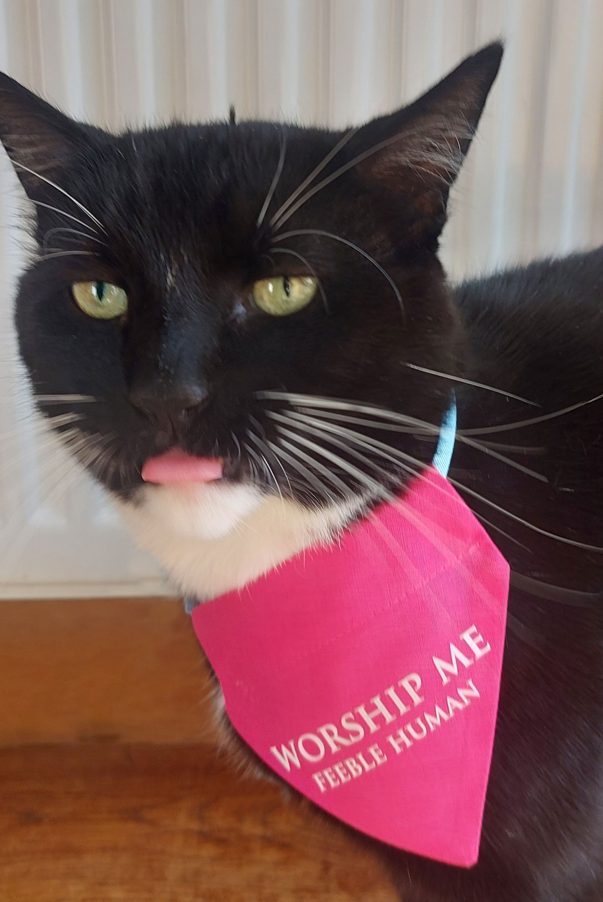 These bandanas slip through the cat's collar for ultimate safety for feline tree-climbers and escapology experts. Cute sayings, with more designs to follow. Hope you love them. Meeeeeeeeeoooooooooowwwwwweeeeeeeee!