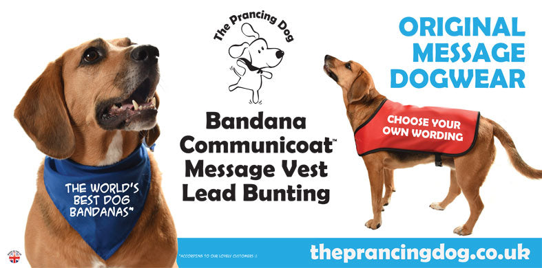 Choose from dog bandanas, including personalised and customised neckerchiefs! Dog coats and message vests - our best selling communicoats and vests can also be customised with your own wording. Lead bunting and lead sleeves. And of course our lovely dog accessories, leads, collars and doggy gifts :)